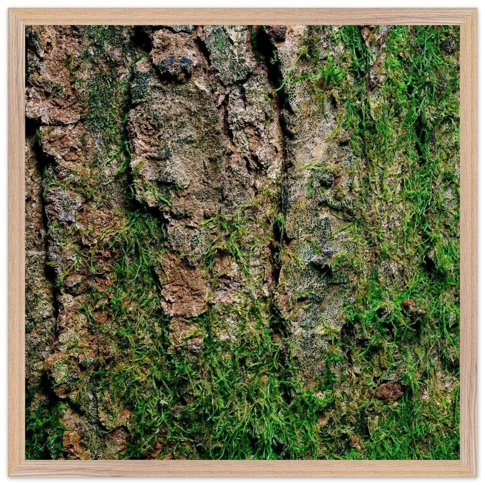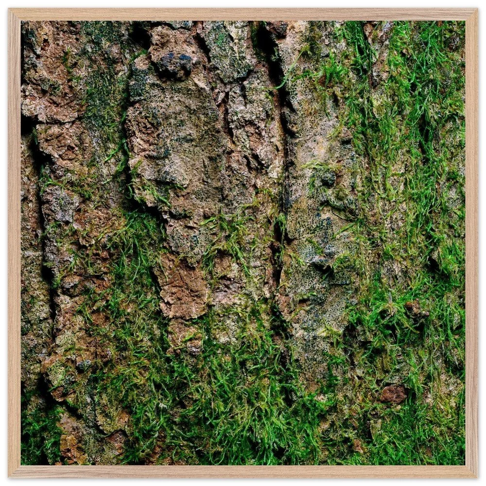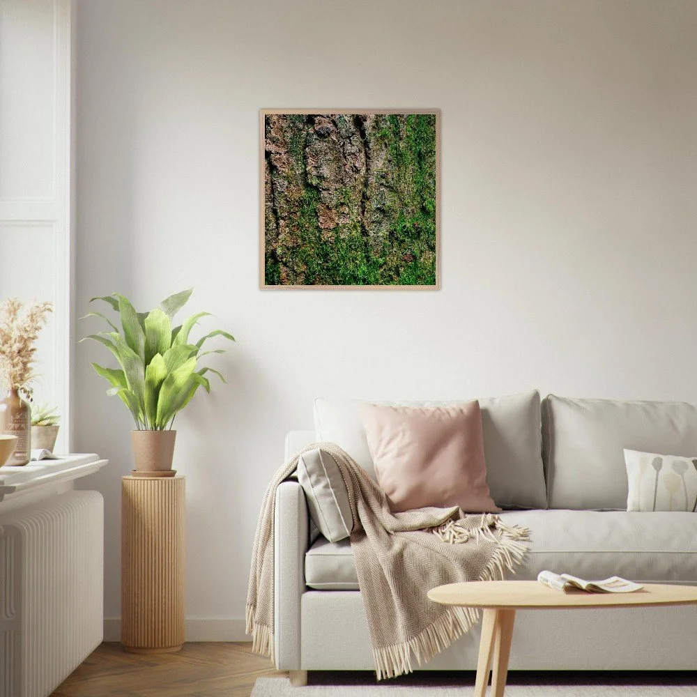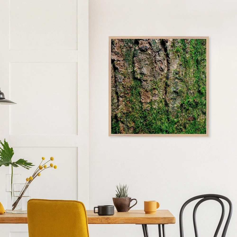 Moss in full force — bright, electric green pouring down rough copper bark like something taking over. This is nature mid-motion, unhurried but unstoppable. Printed on museum-quality, matte archival paper (250 gsm) and housed in a responsibly sourced solid oak or ash frame with shatterproof plexiglass protection. Arrives ready to hang.