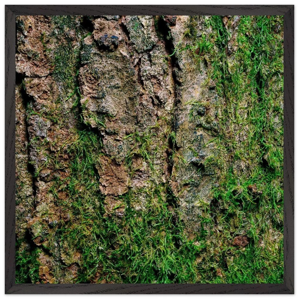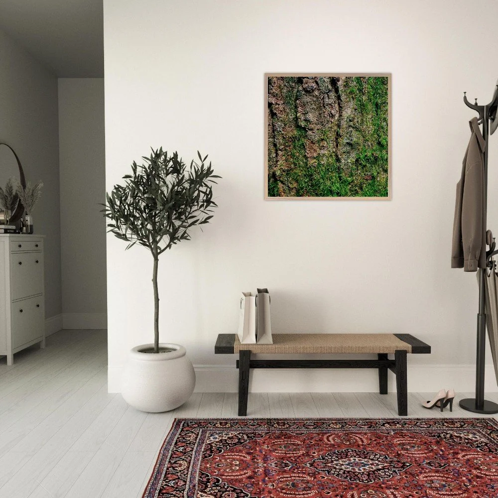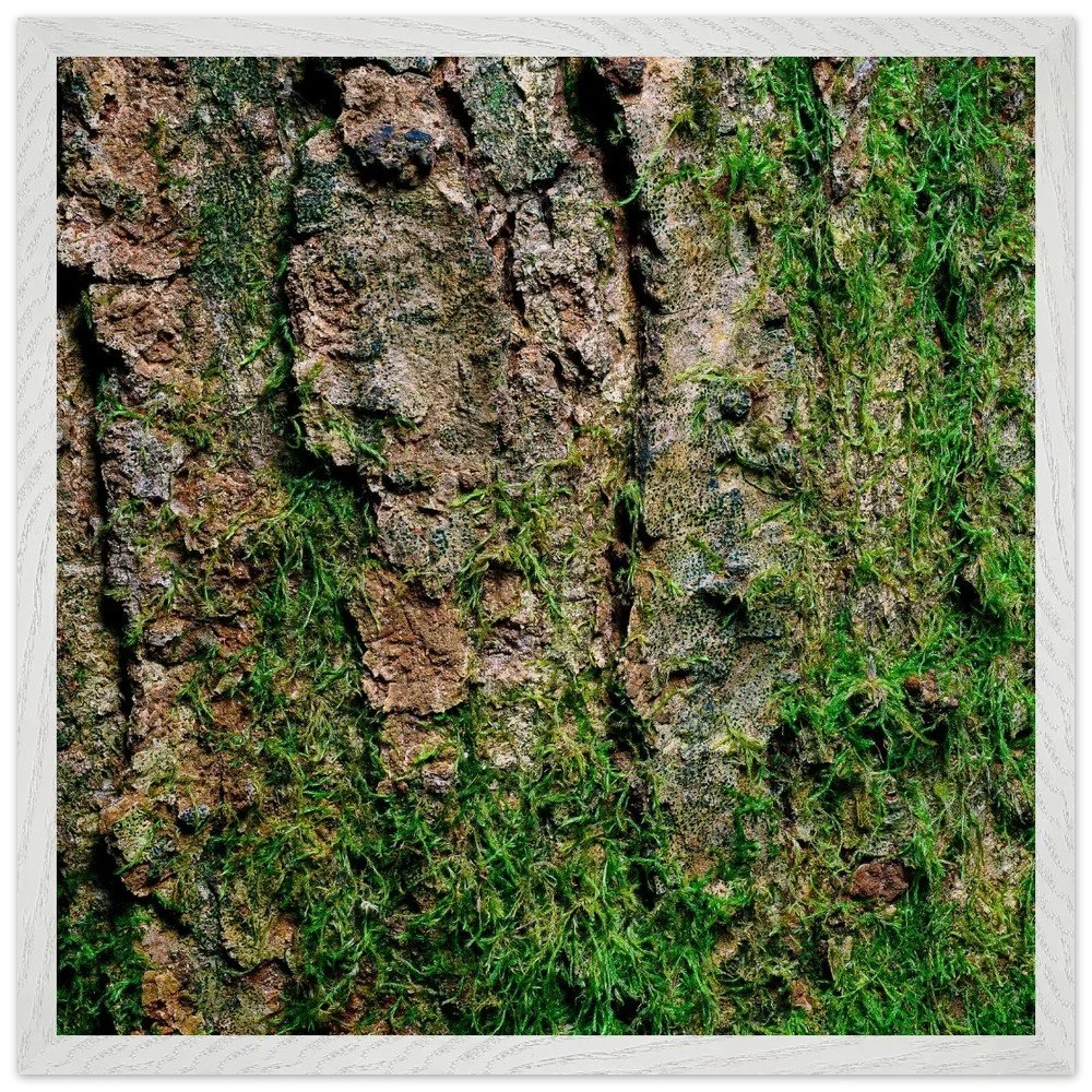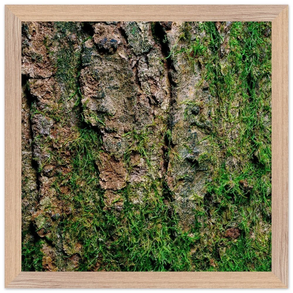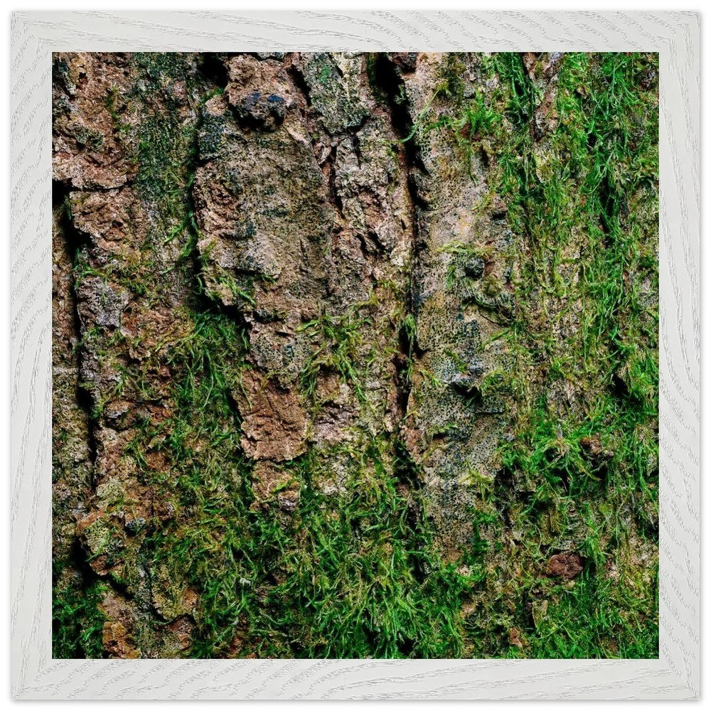 Moss in full force — bright, electric green pouring down rough copper bark like something taking over. This is nature mid-motion, unhurried but unstoppable. Printed on museum-quality, matte archival paper (250 gsm) and housed in a responsibly sourced solid oak or ash frame with shatterproof plexiglass protection. Arrives ready to hang.