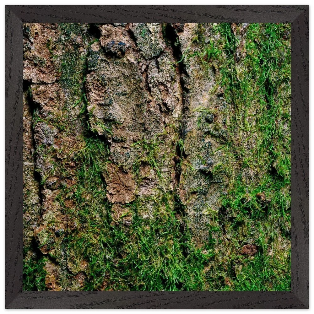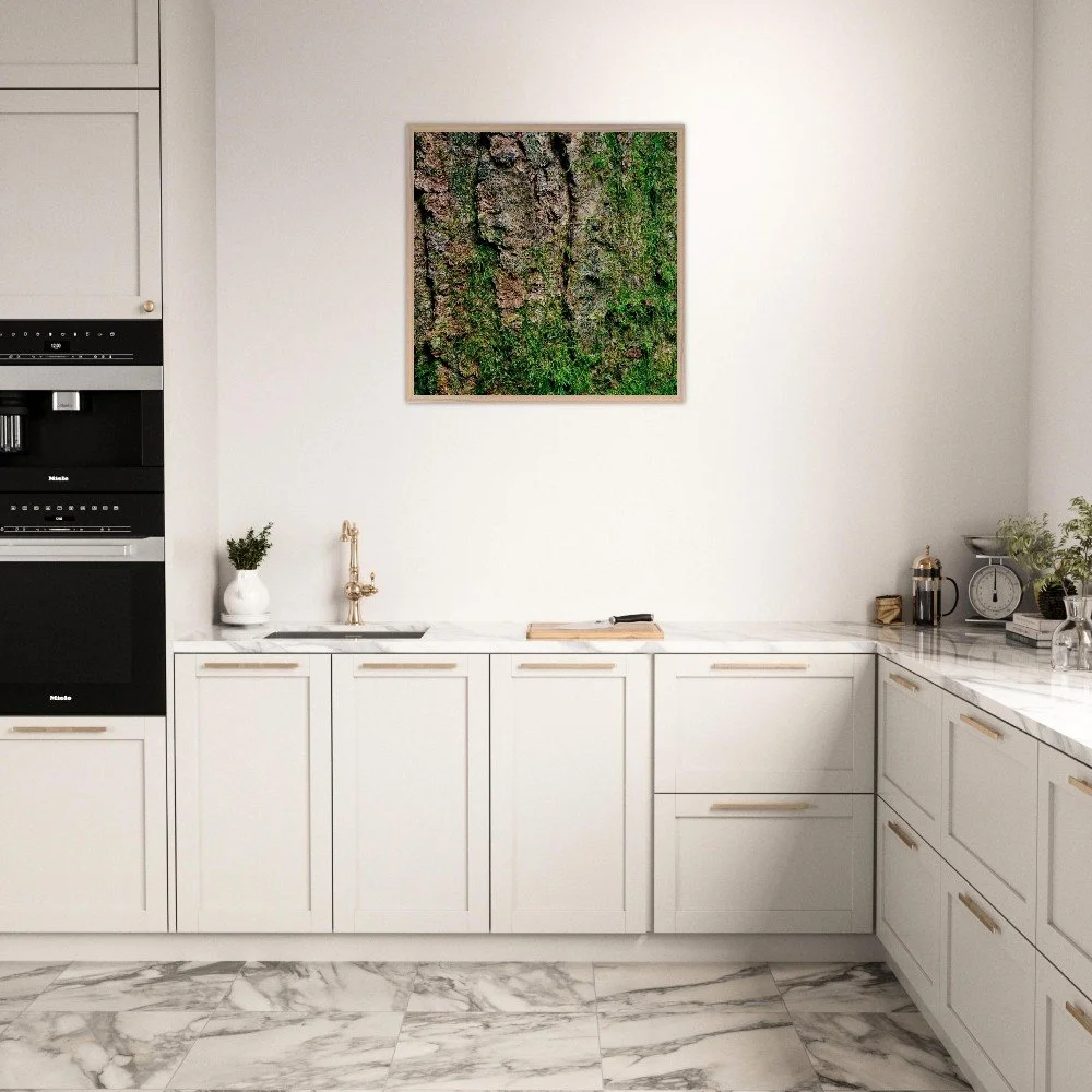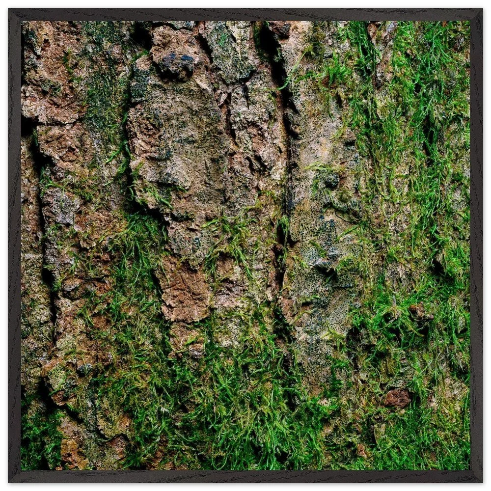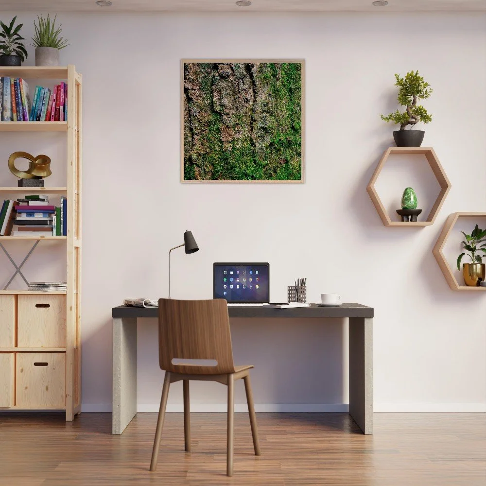 Moss in full force — bright, electric green pouring down rough copper bark like something taking over. This is nature mid-motion, unhurried but unstoppable. Printed on museum-quality, matte archival paper (250 gsm) and housed in a responsibly sourced solid oak or ash frame with shatterproof plexiglass protection. Arrives ready to hang.