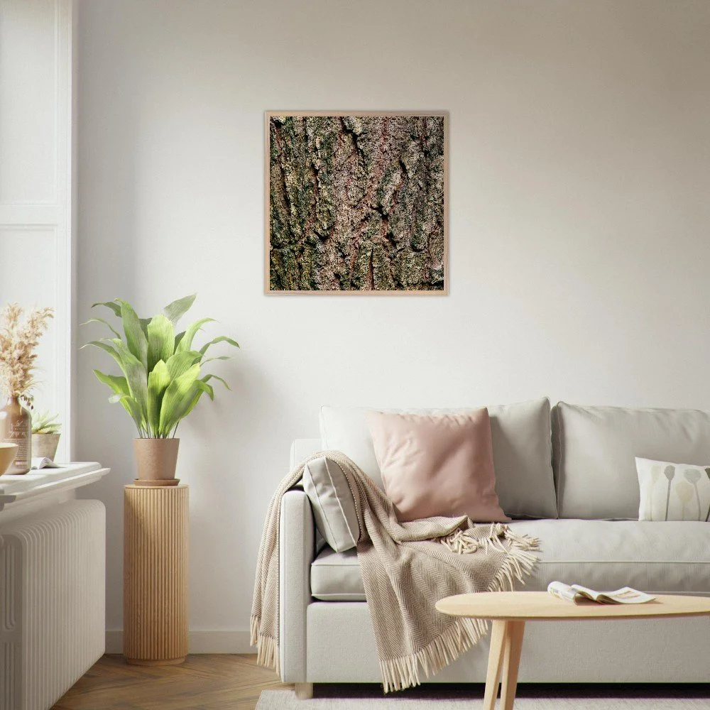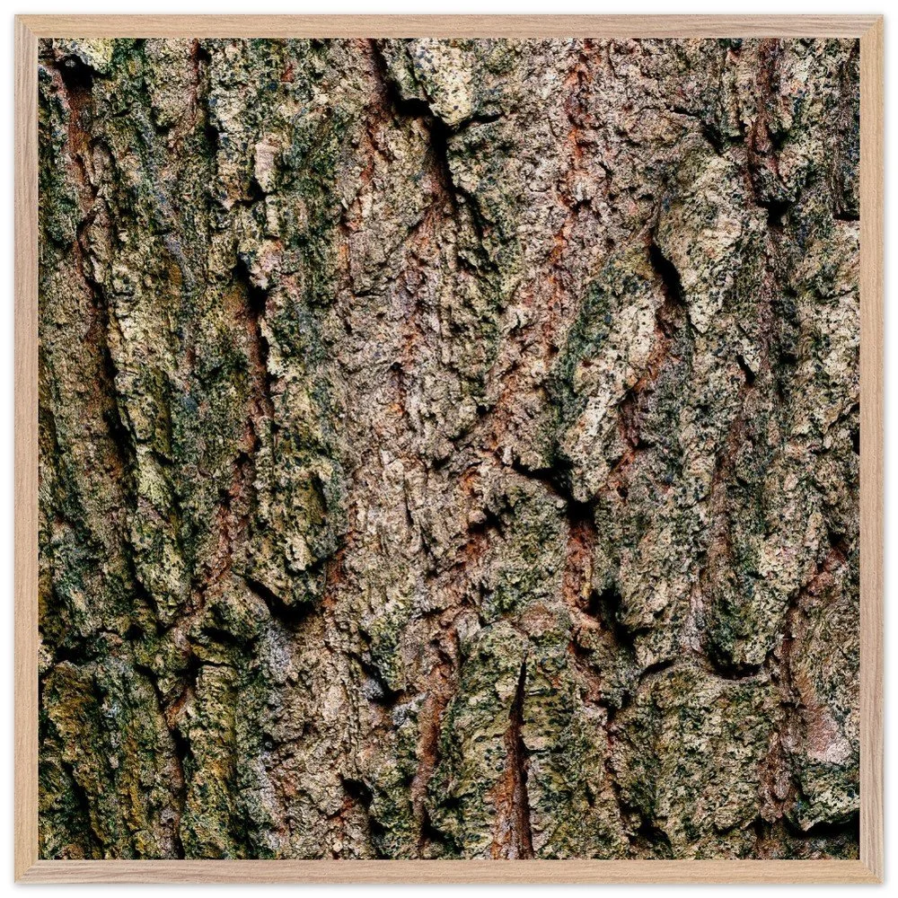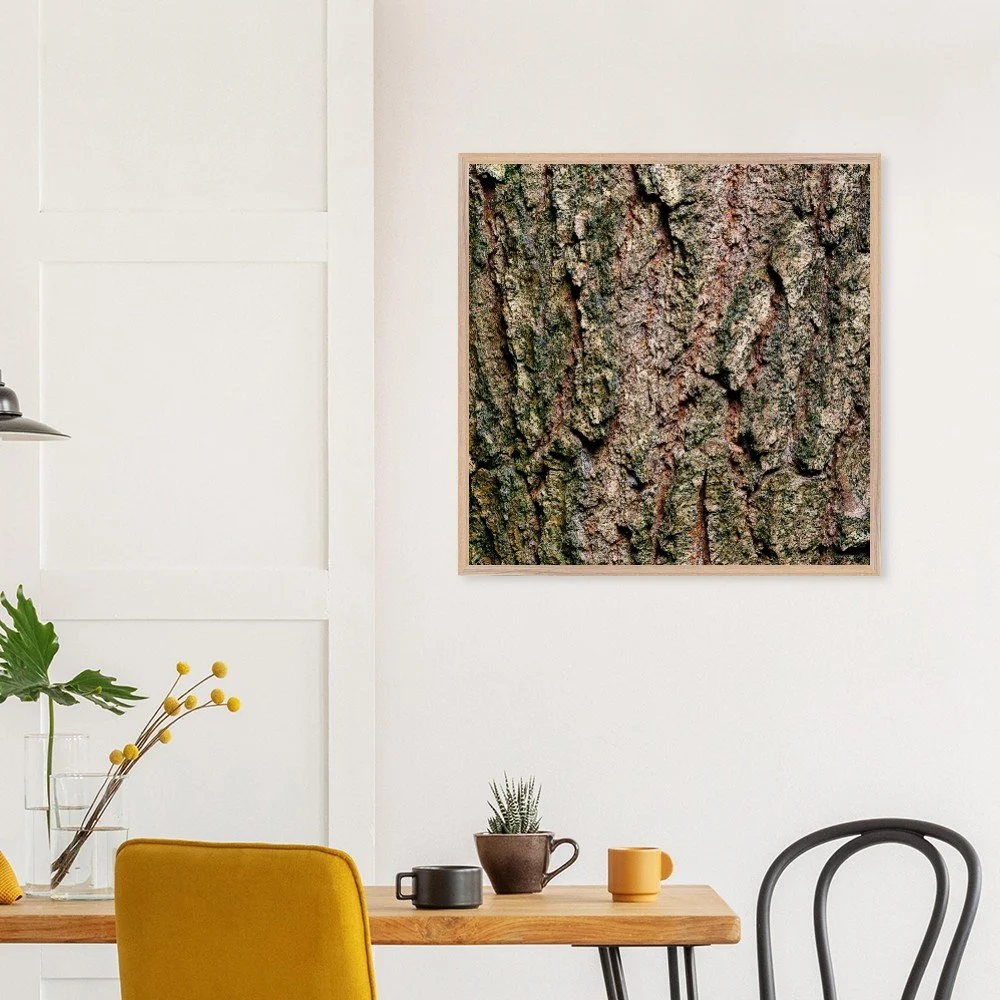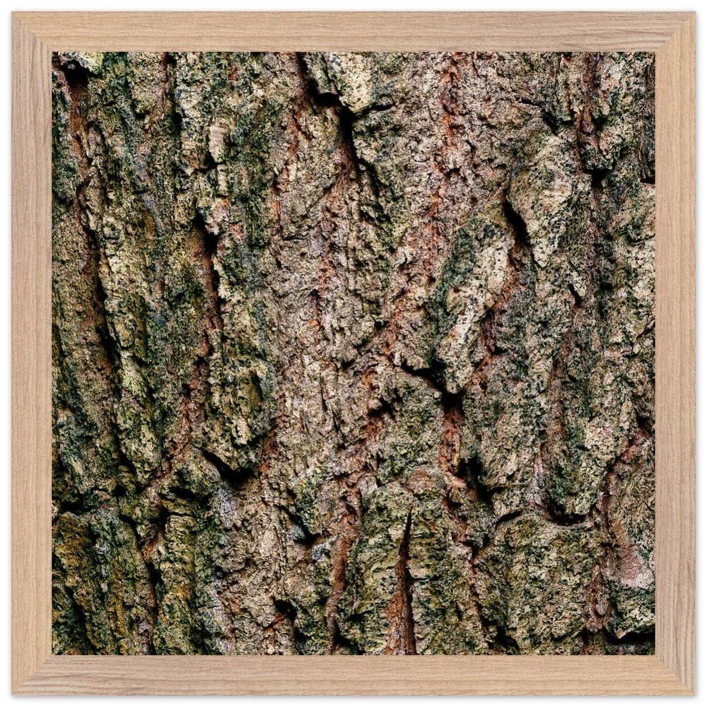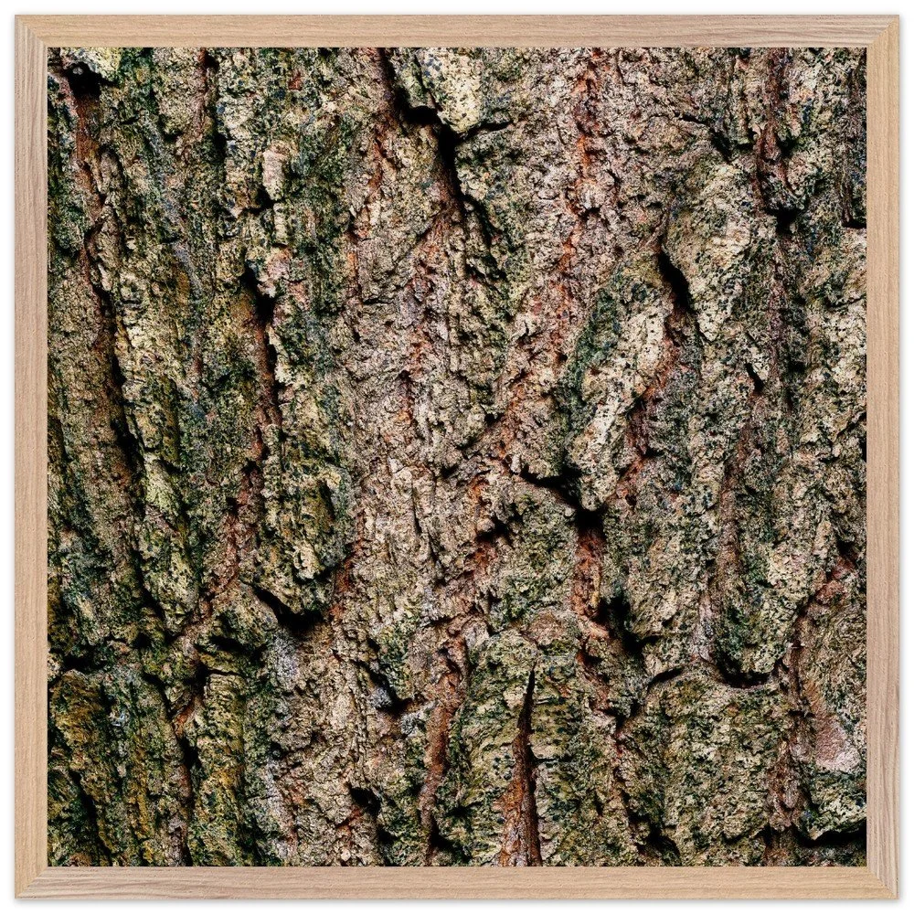 The surface of a tree that has stood for centuries — warm ochre and copper tones broken by deep shadow, textured like cracked leather or stone. A study in quiet endurance. Printed on museum-quality, matte archival paper (250 gsm) and housed in a responsibly sourced solid oak or ash frame with shatterproof plexiglass protection. Arrives ready to hang.