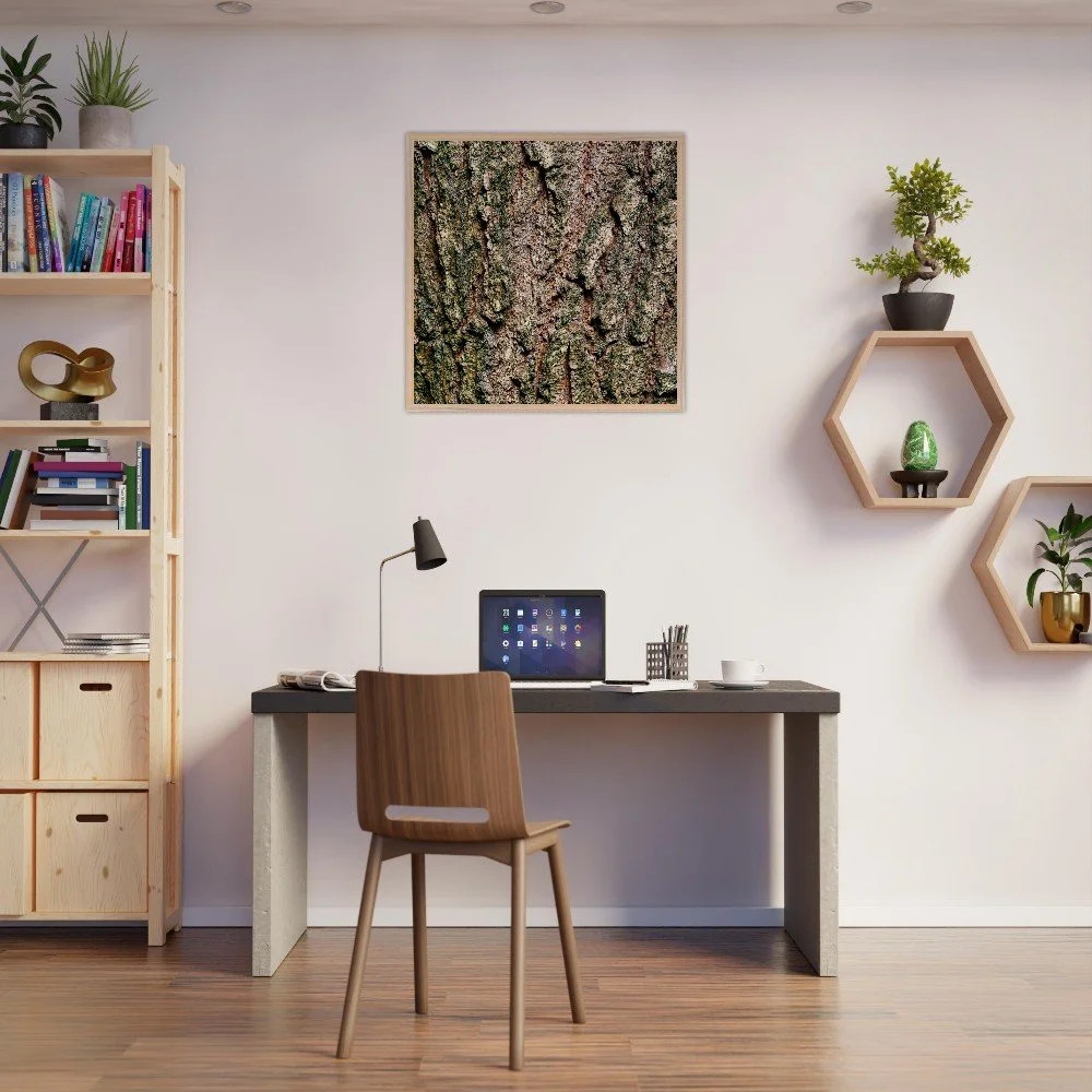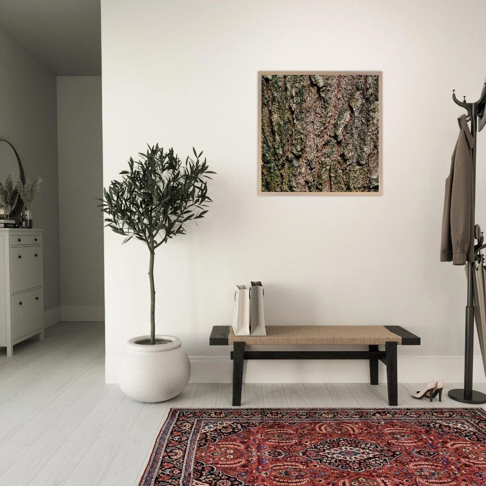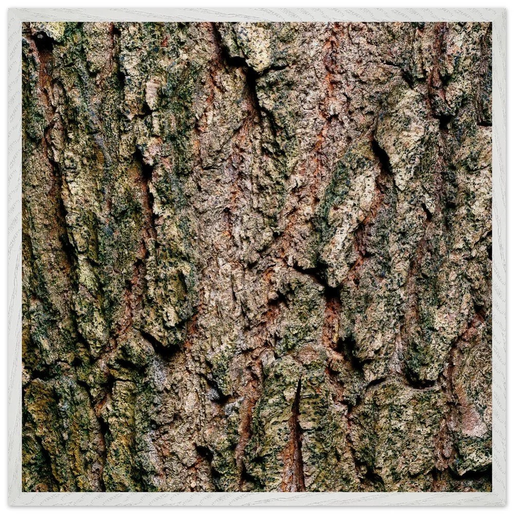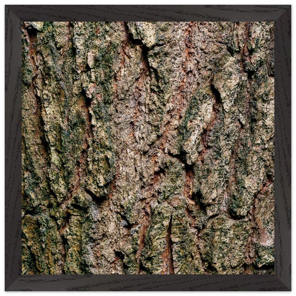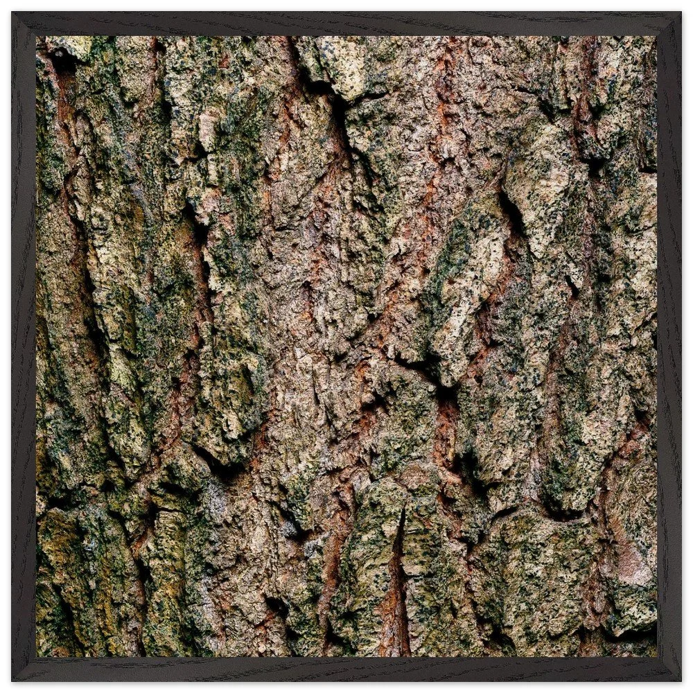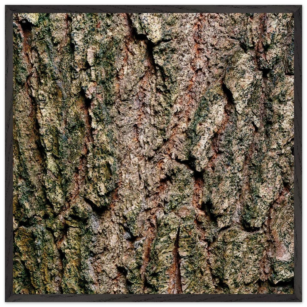 The surface of a tree that has stood for centuries — warm ochre and copper tones broken by deep shadow, textured like cracked leather or stone. A study in quiet endurance. Printed on museum-quality, matte archival paper (250 gsm) and housed in a responsibly sourced solid oak or ash frame with shatterproof plexiglass protection. Arrives ready to hang.