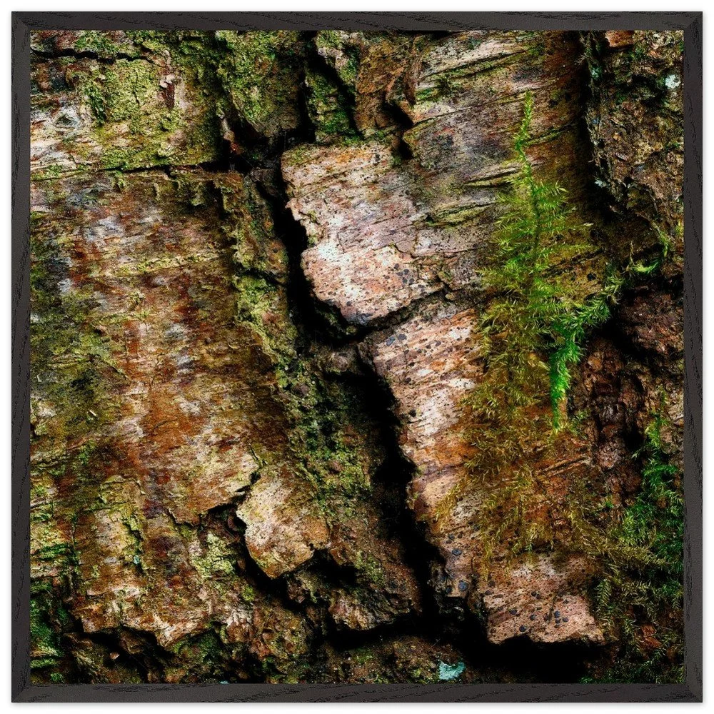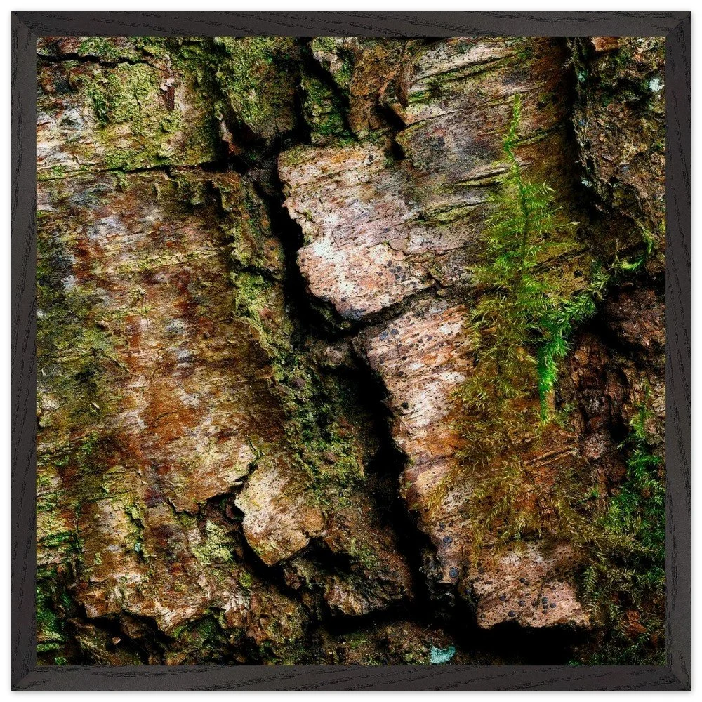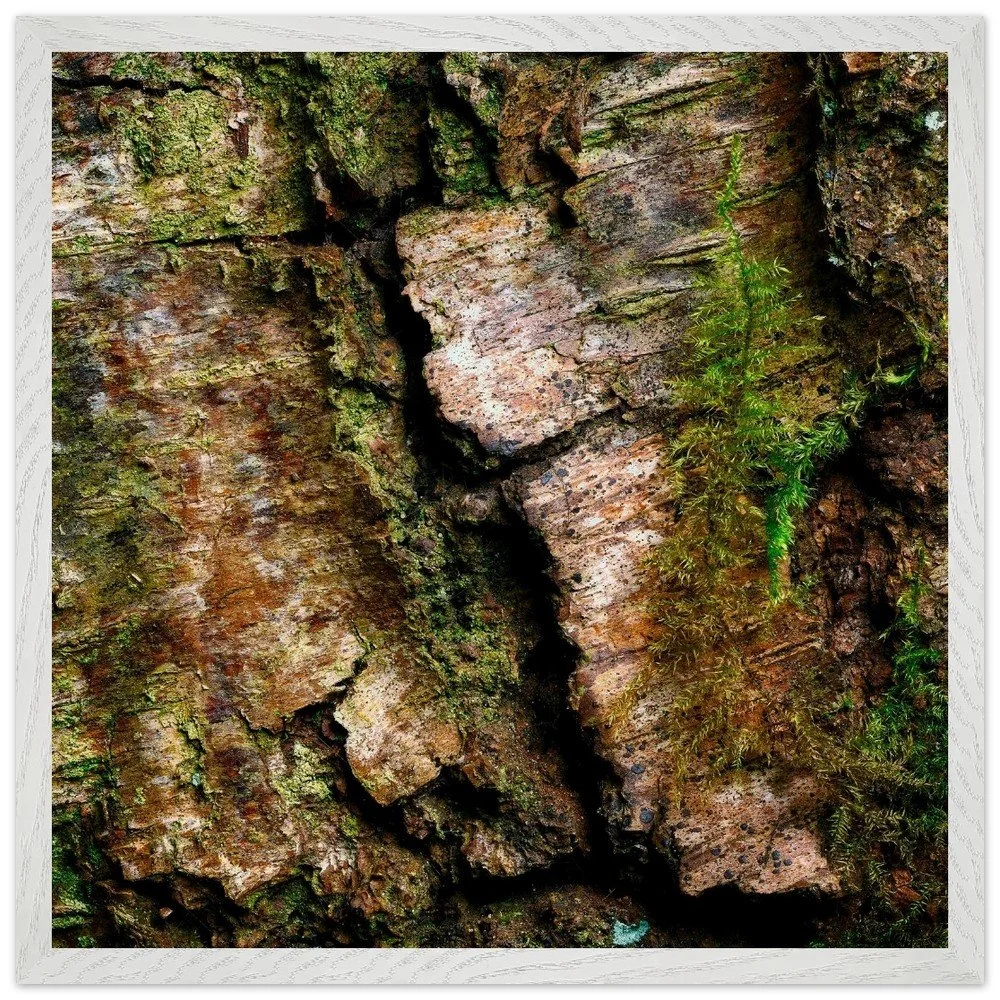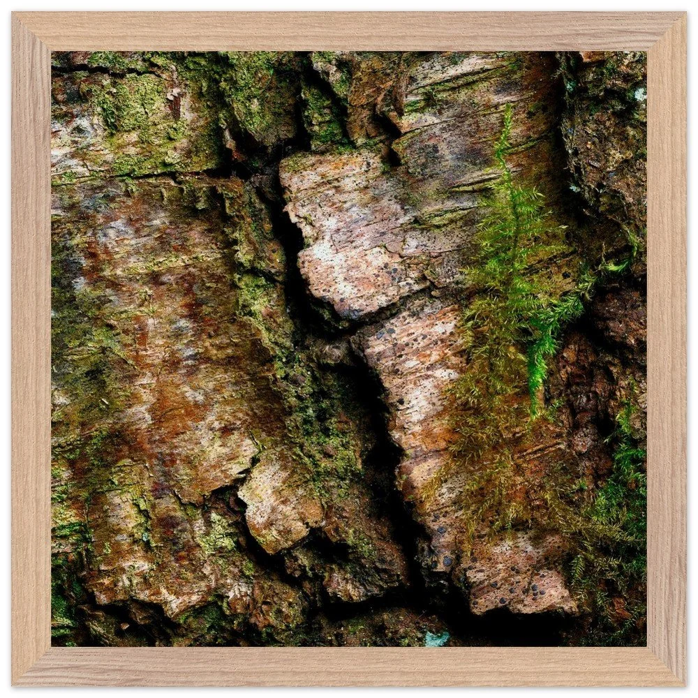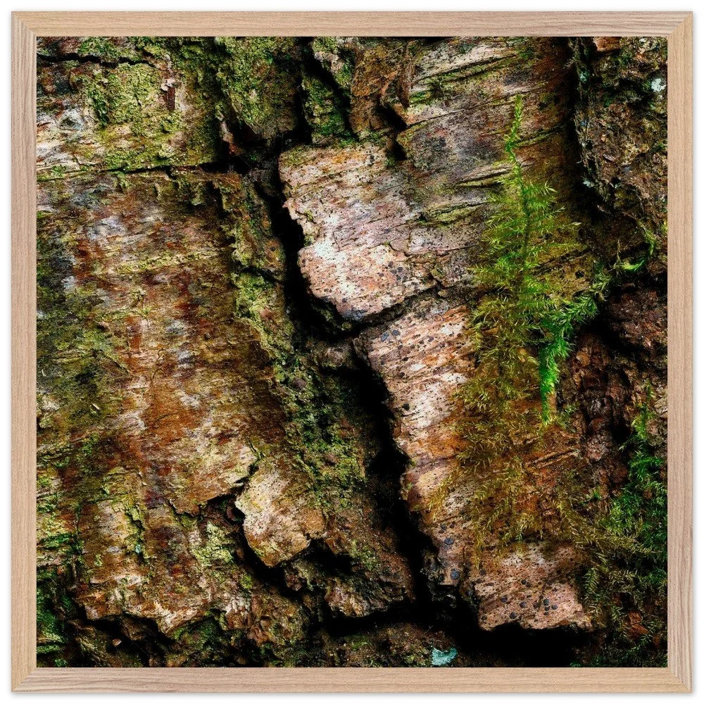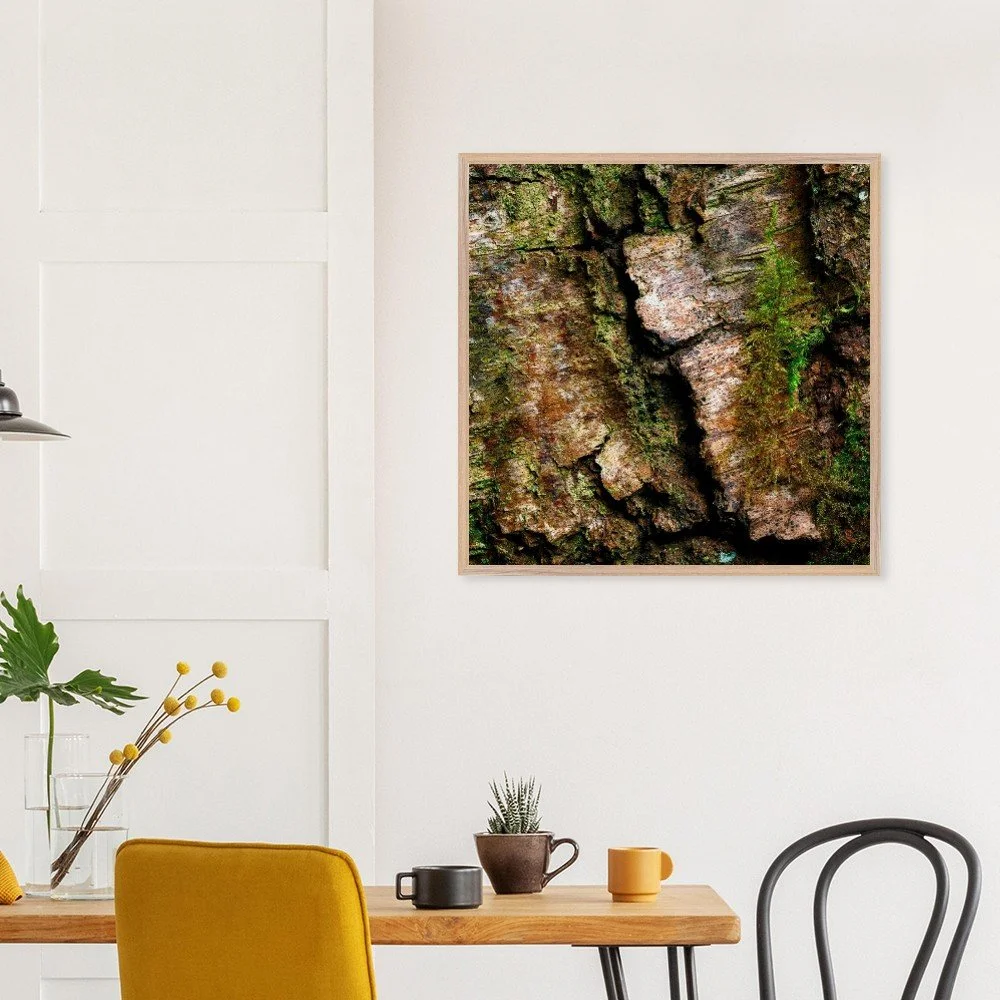 Deep fissures split warm copper bark into great slabs, moss crowding the edges where light can't reach. It looks less like a tree and more like a landscape seen from altitude — a canyon, a fault line, a valley carved over time. Printed on museum-quality, matte archival paper (250 gsm) and housed in a responsibly sourced solid oak or ash frame with shatterproof plexiglass protection. Arrives ready to hang.