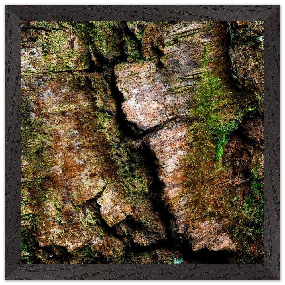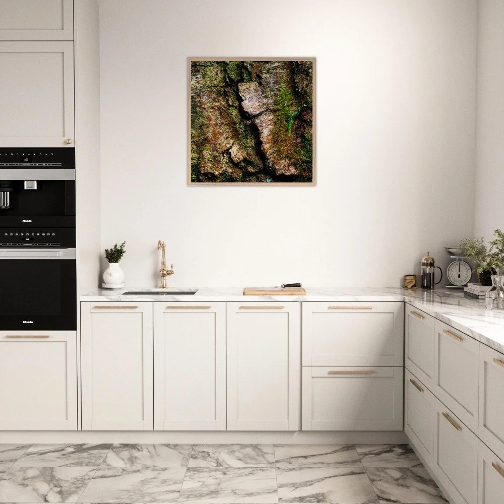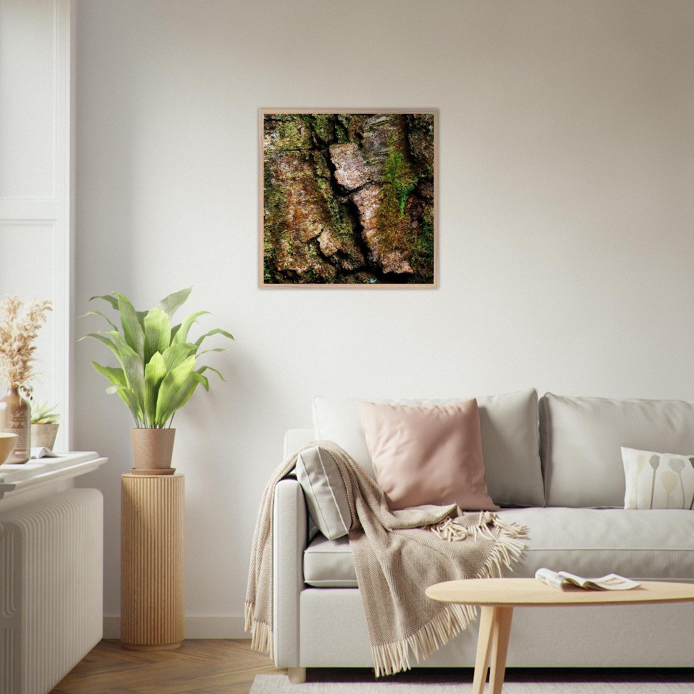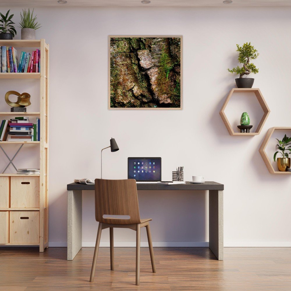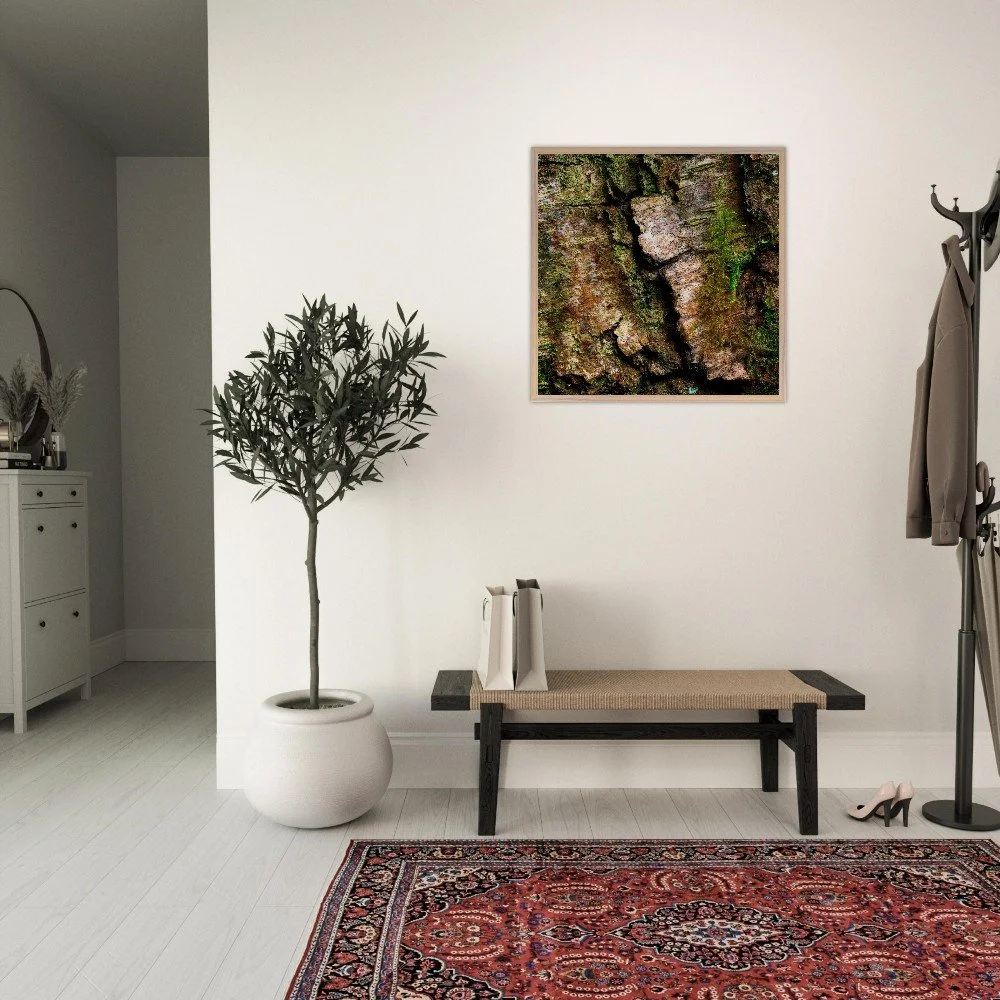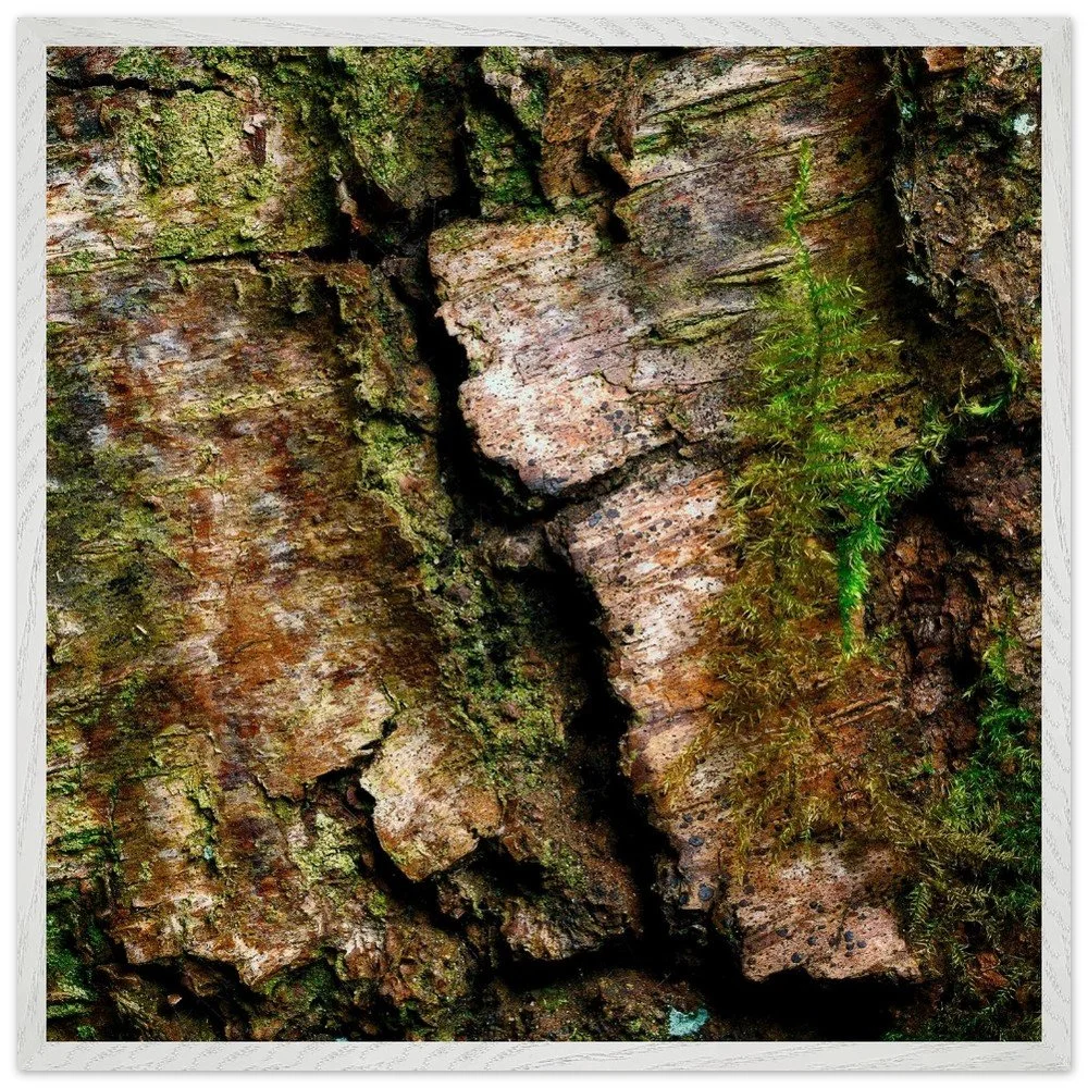 Deep fissures split warm copper bark into great slabs, moss crowding the edges where light can't reach. It looks less like a tree and more like a landscape seen from altitude — a canyon, a fault line, a valley carved over time. Printed on museum-quality, matte archival paper (250 gsm) and housed in a responsibly sourced solid oak or ash frame with shatterproof plexiglass protection. Arrives ready to hang.